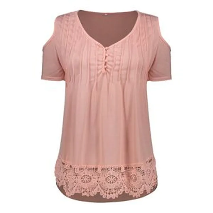 بلوز آستین کوتاه یقه گرد زنانه مدل گیپوردار نخی رنگ صورتی روشن